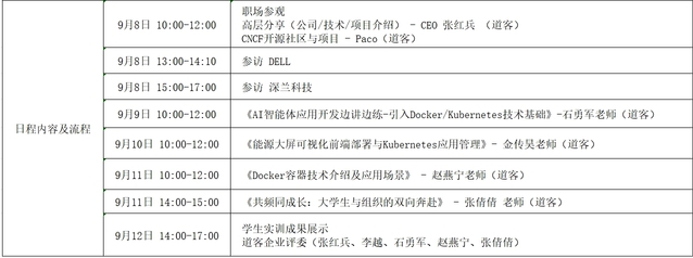 经bet36365路检测中心与道客网络科技公司的多轮协商与精心设计,确定了本次夏令营的主旋律为“企业参访—企业导师线下讲解+任务驱动学生自主探索—学生汇报展示”。学生参访了云原生领域的创新领导者上海道客(DaoCloud)网络科技有限公司、世界500强企业戴尔(DELL)股份有限公司、人工智能领域领军企业深兰人工智能科技(上海)股份有限公司,学习了云原生的核心技术Docker/Kubernets,并以小组形式完成了“能源大屏可视化前端部署”、“AI智能体应用开发”项目的设计、开发与部署。道客公司首席执行官张红兵、开源总负责人徐俊杰Paco、技术总监李越、技术专家石勇军、技术专家金传昊、技术专家赵燕宁、人力资源总监张倩倩参与分享与授课,并参加学生汇报答辩评审。同学们答辩表现优秀,现场收到企业的实习邀请。