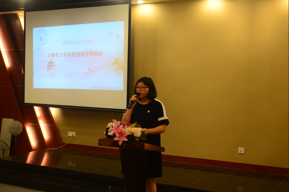 学院党委副书记余南飞老师发表讲话,她表示首先感谢筹备人员,其次她对上一届团学干部表示肯定 ,并对新一届团学干部提出了以下要求:1要学会继承和发扬; 2 完善和创新,例如微信公众号改版、临港兄弟院校共建等; 3理解和尊重; 4学习方面的提升和创新性工作的进取,要坚持知行合一,注重在实践中学真知、悟真谛,加强磨练、增长本领。