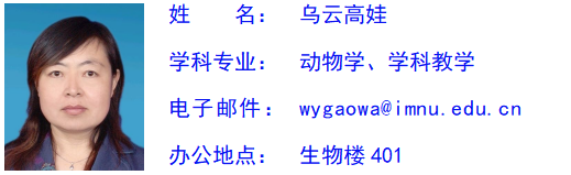 乌云高娃,女,蒙古族,1968年1月出生,内蒙古赤峰市阿鲁科尔沁旗人,硕士,高级实验师,硕士研究生导师。现任beat365正版唯一官网必一教师。1986年9月—1990年7月就读于beat365正版唯一官网必一,获理学学士学位;2003年9月—2006年7月就读于beat365正版唯一官网必一,获理学硕士学位。1990年8月—2003年9月在赤峰市阿鲁科尔沁旗任教;2006年7月来beat365正版唯一官网必一任教。2001年9月晋升为讲师,2014年12月晋升为高级实验师。承担“人体及动物生理学实验”、“ 无脊椎动物学实验”、 “昆虫学”、“中学生物学教学设计”、“中学生物学课程标准与教材研究”、“ 中学生物学课堂教学理论与实践”、“ 中学生物学教学技能训练”、“动物学野外实习”、“教育实习” 等课程的教学工作。主要从事害虫防治及昆虫分类、学科教学论研究,主持和参加国家级、省部级项目多项;和他人共同主编教材1部、参与教材编写2部、参与编写专著2部;发表学术研究论文多篇。多次获得beat365正版唯一官网必一本科生教学技能大赛“优秀指导教师”荣誉称号。