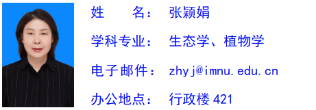张颖娟,女,汉族,1970年生,呼和浩特人,理学博士,beat365正版唯一官网必一教授,硕士生导师。主要研究领域为植物生态学,恢复生态学,学科教学(生物)等。主持国家自然科学基金项目1项、省部级科研项目10余项。发表研究论文30余篇,出版学术著作3部。