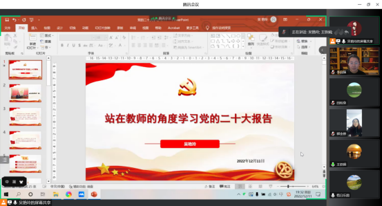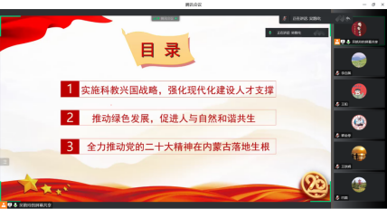 近日,支部书记吴艳玲老师通过讲主题党课的方式,结合支部专业特色和党员教师职能带领大家一起学习了党的二十大精神。原原本本学习了大会主题、科教兴国战略、生态文明建设和如何推动党的二十大精神在内蒙古落地生根等内容。