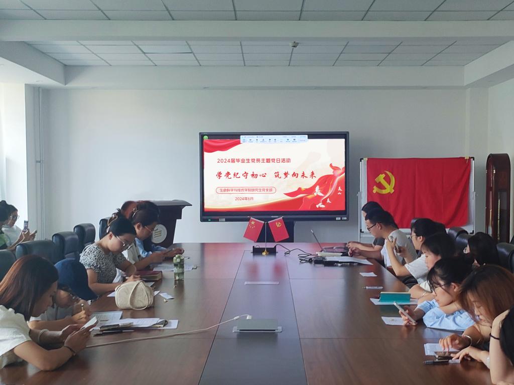 为深入贯彻党纪学习教育,切实增强毕业生党员的责任感与使命感,确保毕业生党员始终铭记党员身份,坚定理想信念,强化责任担当,厚植家国情怀,无惧艰难险阻,以期在未来学习和工作岗位上持续发挥党员的先锋模范作用。研究生党支部于6月28日在生物楼三楼会议室举办了“学党纪,守初心,筑梦向未来”毕业生党员主题党日活动。本次活动由研究生党支部书记默原同志主持,支部全体党员及发展对象通过线上线下相结合的方式共同参与。