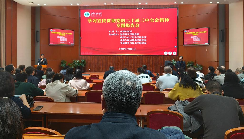 为深入学习贯彻党的二十届三中全会精神,10月24日下午,学院党委联合数学科学学院、物理与电子信息学院和化学与环境科学学院在信息楼报告厅举办学习宣传贯彻党的二十届三中全会精神专题报告会暨党委理论学习中心组(扩大)第9次集体学习会,邀请学习贯彻党的二十届三中全会精神学校宣讲团成员、马克思主义学院党委书记张瑞军教授作专题辅导报告。