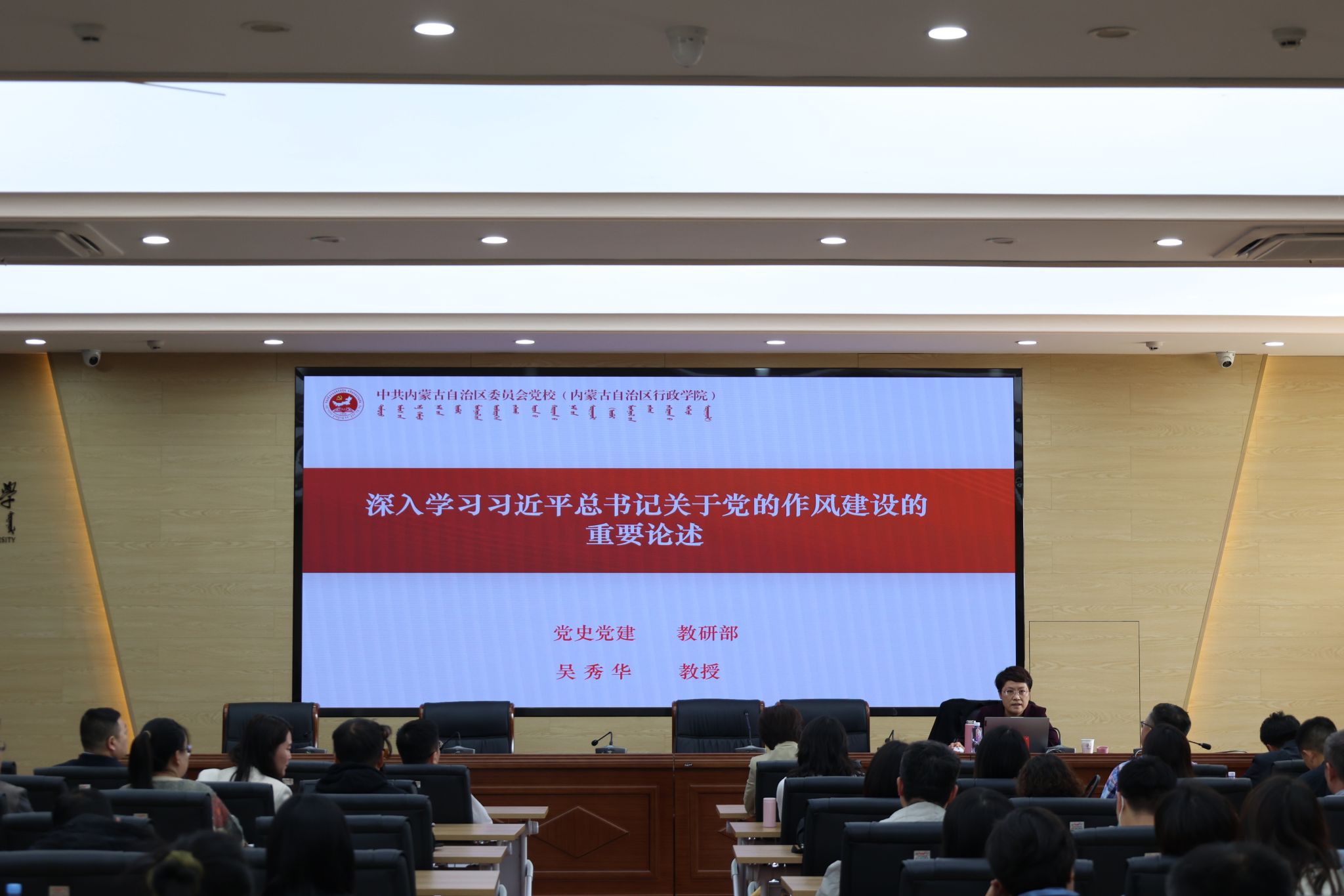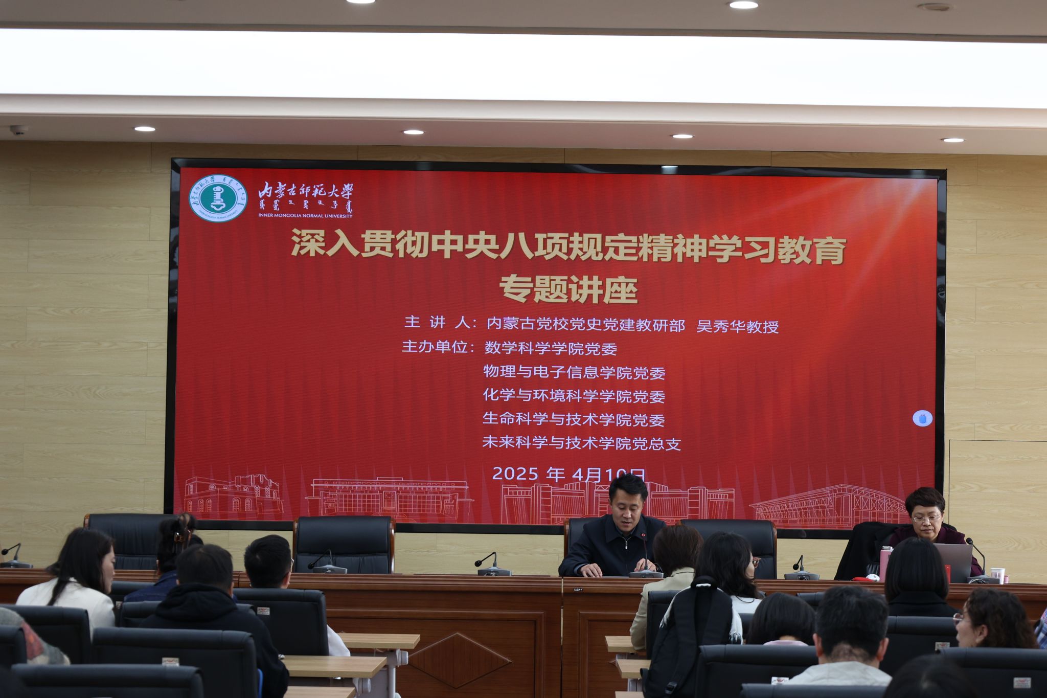 根据学院党委深入贯彻中央八项规定精神学习教育工作安排,4月10日下午,学院联合数学科学学院、物理与电子信息学院、化学与环境科学学院和未来科学与技术学院在赛罕校区行政楼三楼报告厅举办深入贯彻中央八项规定精神学习教育读书班专题辅导暨党委理论学习中心组(扩大)2025年第6次集体学习会。讲座特邀内蒙古党校党史党建教研部吴秀华教授作题为“深入学习习近平总书记关于党的作风建设的重要论述”专题辅导。苏小波主持会议。