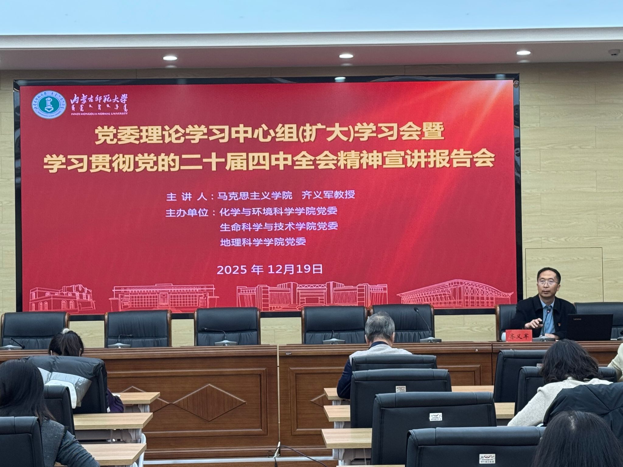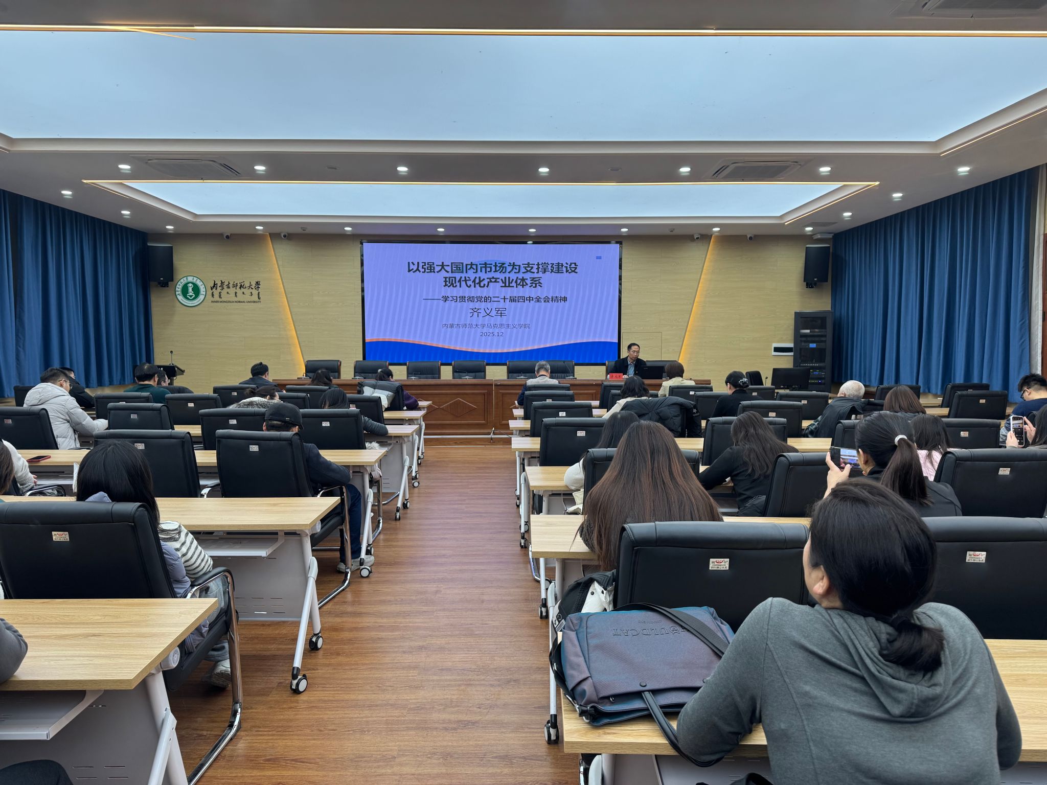 会上,齐义军教授以《以强大国内市场为支撑建设现代化产业体系》为题,围绕立足内需、建设现代化产业体系、纵深推进全国统一大市场建设以及内蒙古服务国家发展大局等方面,对党的二十届四中全会精神进行了系统阐释和深入解读。报告政治站位高、理论阐释深、实践导向强,为准确把握全会精神、强化使命担当提供了重要指导。
