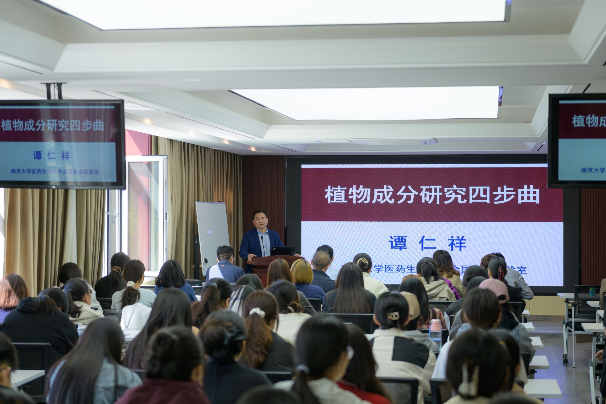 4月27日上午,中国植物学会副理事长、南京大学医药生物技术全国重点实验室主任、国家杰出青年科学基金获得者、长江学者谭仁祥教授应内蒙古自治区植物学会和beat365正版唯一官网必一邀请,为beat365官网师生作了题为“植物成分研究四步曲”的学术报告。学院党委副书记院长红雨、内蒙古自治区植物学会理事长徐杰、秘书长杜超、内蒙古自治区昆虫学会理事长白晓拴及beat365官网100余名师生参加报告会。报告会由学院党委副书记、副院长高峰主持。