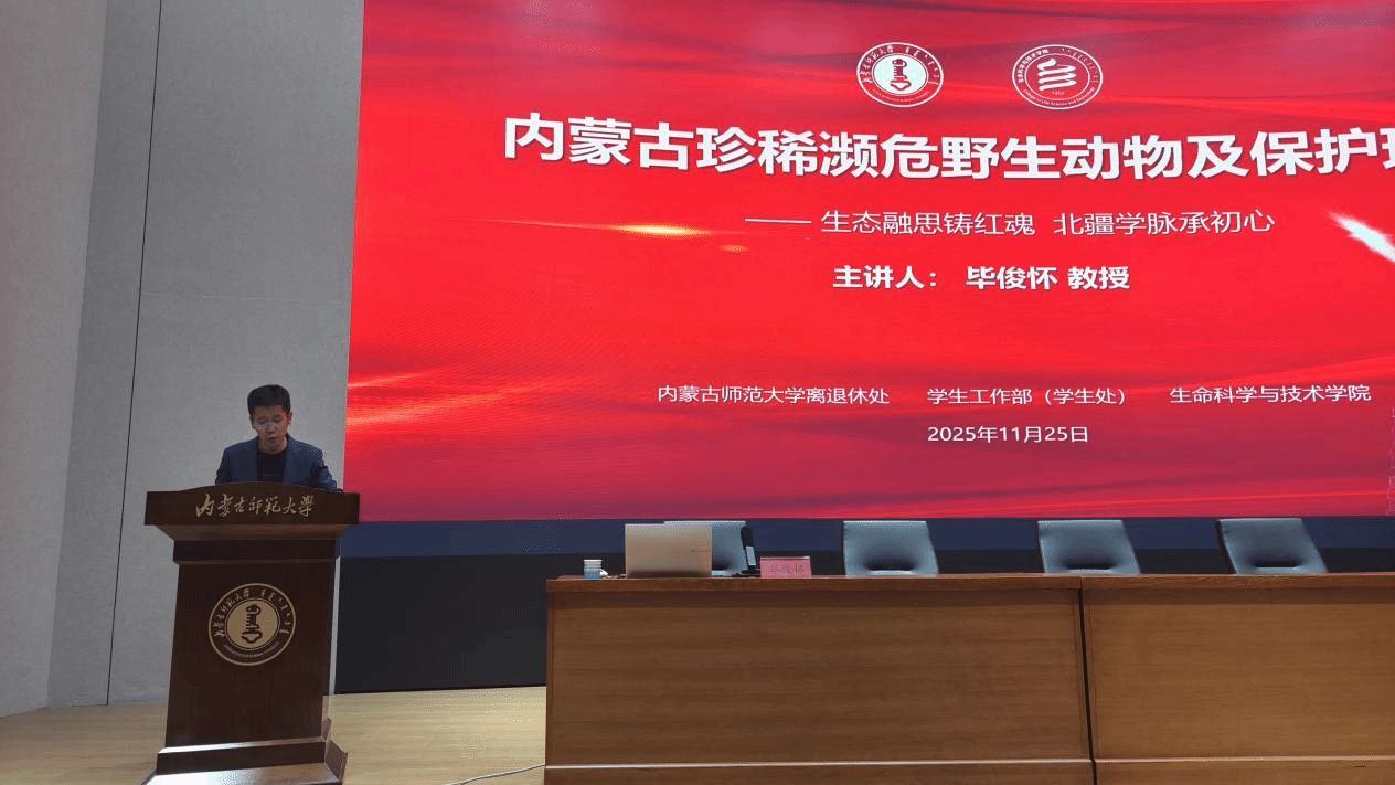 为扎实推进党建与育人工作深度融合,营造良好的学风氛围,2025年11月25日,beat365正版唯一官网必一学生工作部(学生工作处)、离退休教职工工作处联合主办,beat365正版唯一官网必一承办的离退休教授宣讲活动在赛罕校区信息楼学术报告厅举行。本次活动以"生态融思铸红魂,北疆学脉承初心"为主题,邀请毕俊怀教授做了题为《内蒙古珍稀濒危有蹄类动物资源现状与保护》的专题讲座。